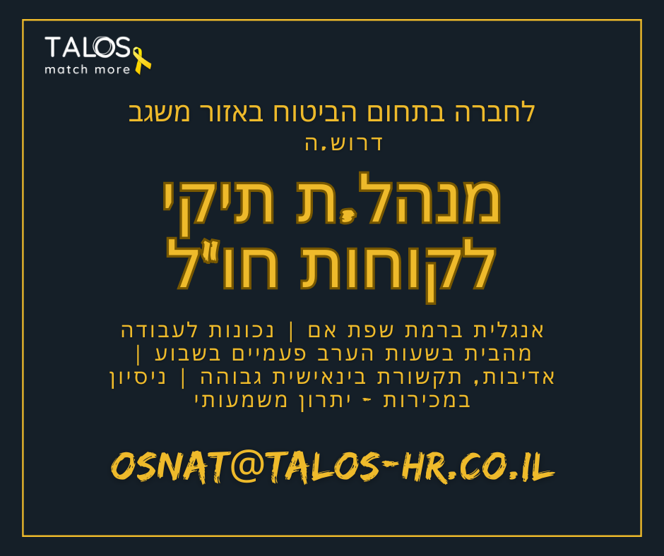 ניהול תיקי לקוחות מנהל.ת תיקי לקוחות חו"ל לשלוחה צפונית חדשה של חברה בתחום הביטוח של תהליכי פונדקאות בחו"ל דרוש.ה מנהל.ת תיקי לקוחות בעל.ת רגישות, אדיבות ותקשורת קראו עוד משגב