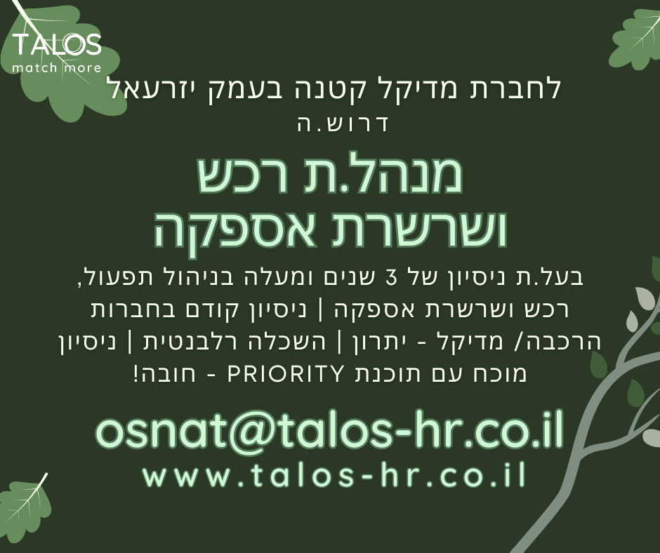 ניהול ייצור ותפעול, תפ"י רכש ולוגיסטיקה מנהל.ת רכש ושרשרת אספקה לחברת מדיקל קטנה בעמק יזרעאל דרוש.ה מנהל.ת רכש ושרשרת אספקה לתפקיד מפתח בחברה בכפיפות ישירה למנכ"ל. התפקיד כולל: ניהול קראו עוד עמק יזרעאל