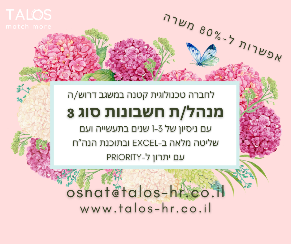 כספים מנהל/ת חשבונות לחברה טכנולוגית קטנה, הממוקמת במשגב, דרוש/ה מנהל/ת חשבונות סוג 3 עם ניסיון של שנה – 3 שנים בתעשייה ועם קראו עוד