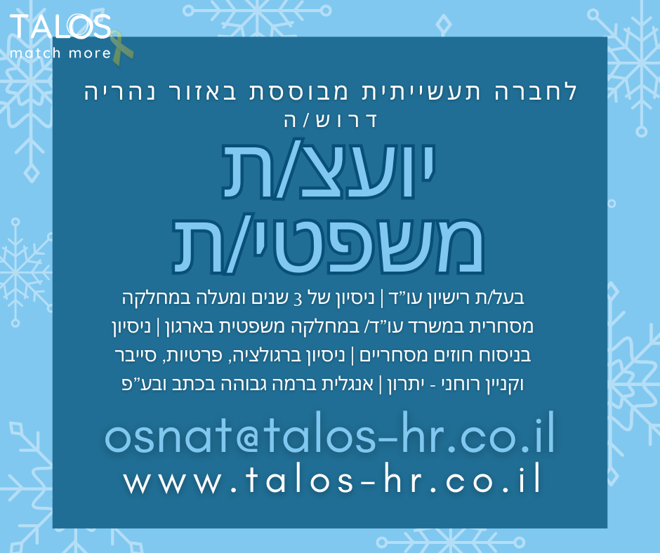 עריכת דין יועצ/ת משפטי/ת לחברה תעשייתית גלובלית, ותיקה ומבוססת, הממוקמת באזור גליל מערבי דרוש/ה יועצ/ת משפטי/ת בעל/ת 3 שנות ניסיון ומעלה (לא כולל קראו עוד גליל מערבי