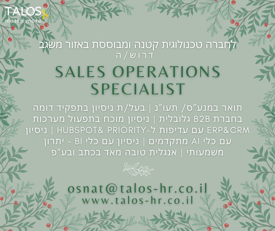 לחברה טכנולוגית קטנה ומבוססת, הממוקמת במשגב, דרוש/ה sales operations specialist – יד ימינו של סמנכ"ל שיווק ומכירות בחברה. התפקיד מצריך